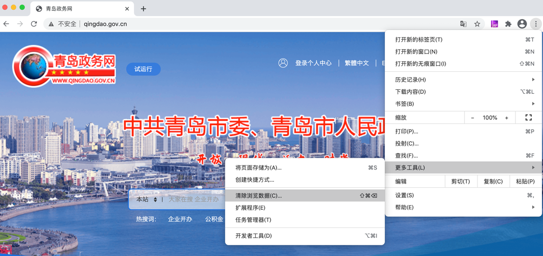點(diǎn)擊谷歌瀏覽器的更多工具->清除瀏覽數(shù)據(jù)選項(xiàng),