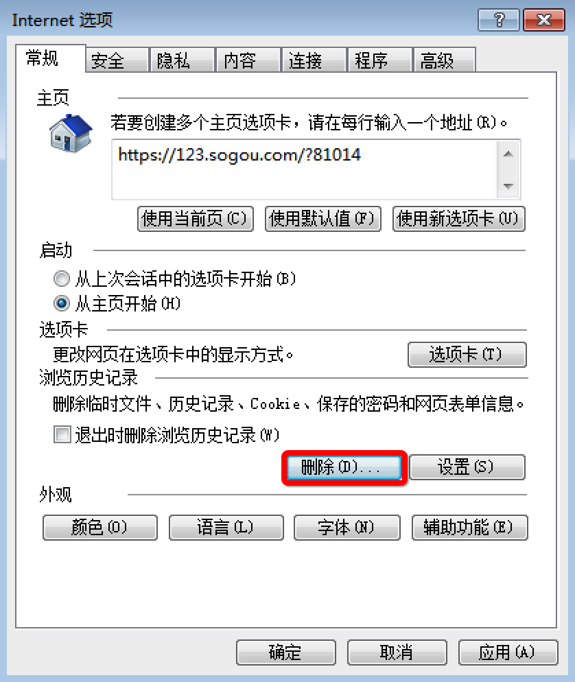 點(diǎn)擊IE瀏覽器的Internet選項(xiàng),在彈出的選項(xiàng)卡中,點(diǎn)擊刪除按鈕。