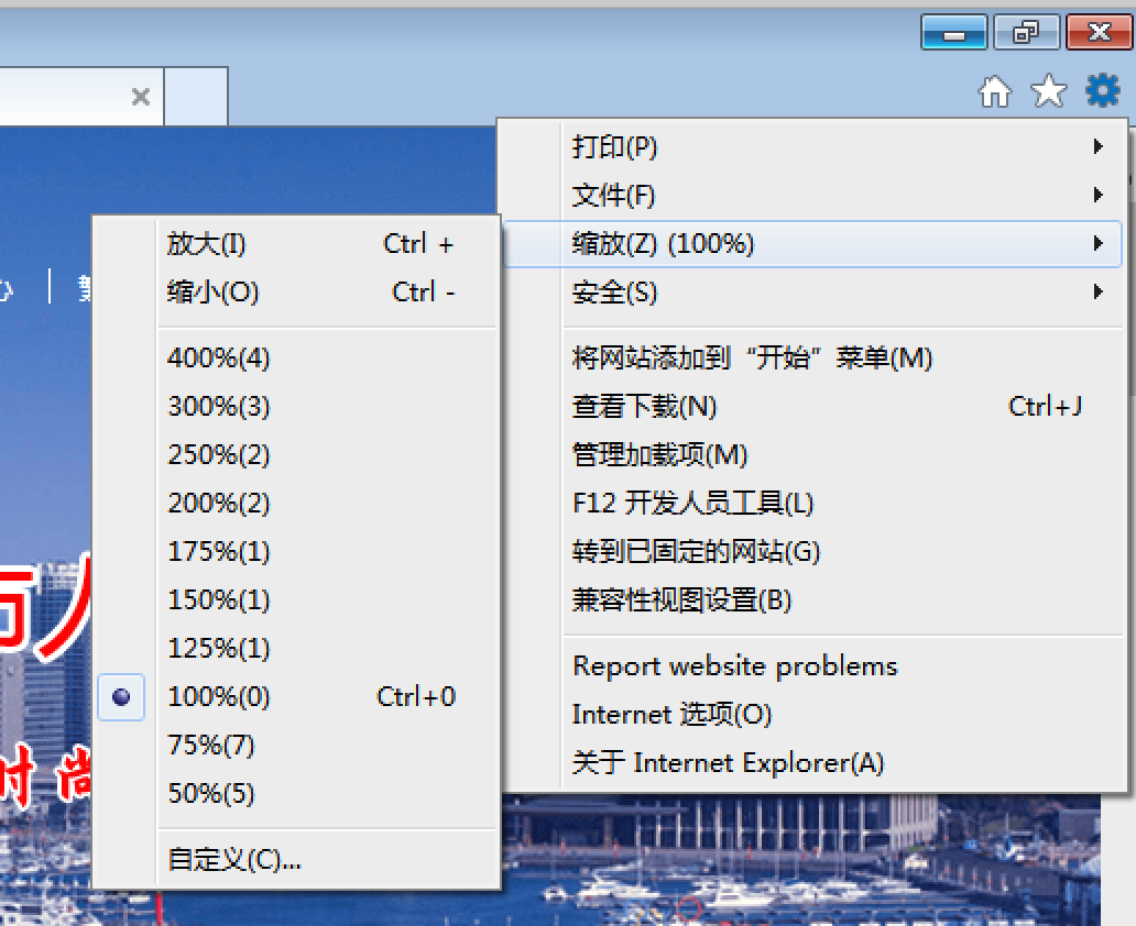 瀏覽器縮放設(shè)置,以IE瀏覽器為例進(jìn)行說(shuō)明:點(diǎn)擊瀏覽器“工具”菜單->縮放,推薦使用100%。