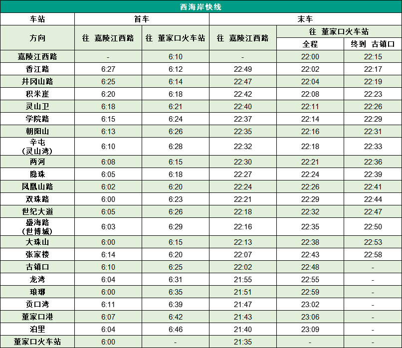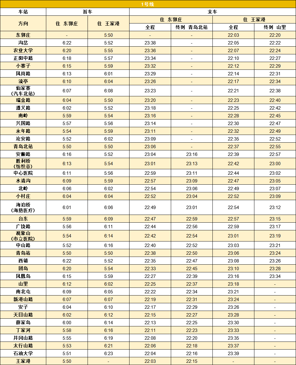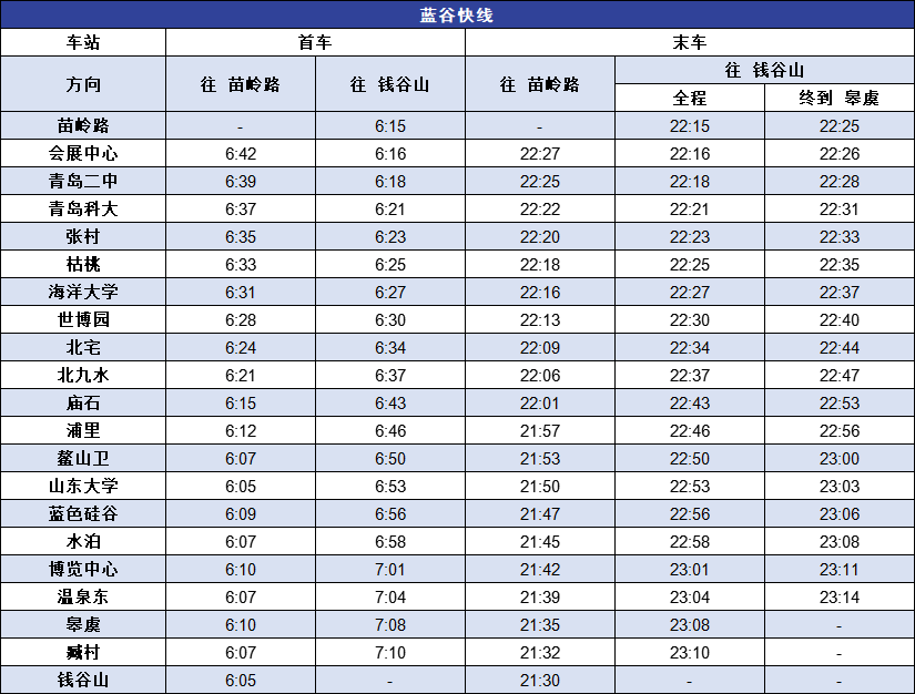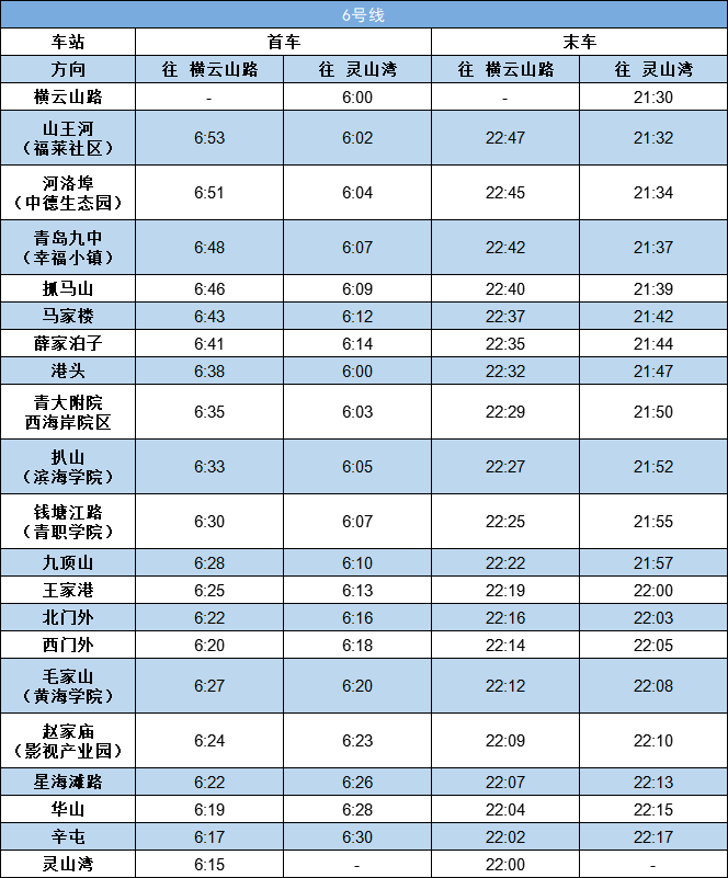 青島地鐵1號(hào)線運(yùn)營(yíng)時(shí)間17.85小時(shí)、2號(hào)線運(yùn)營(yíng)時(shí)間17.57小時(shí)、3號(hào)線運(yùn)營(yíng)時(shí)間17.43小時(shí)、4號(hào)線運(yùn)營(yíng)時(shí)間17.63小時(shí)、6號(hào)線運(yùn)營(yíng)時(shí)間16.83小時(shí),8號(hào)線運(yùn)營(yíng)時(shí)間17.45小時(shí),藍(lán)谷快線運(yùn)營(yíng)時(shí)間17.20小時(shí)、西海岸快線運(yùn)營(yíng)時(shí)間17.23小時(shí)(各線路首末班車時(shí)刻見下圖)。