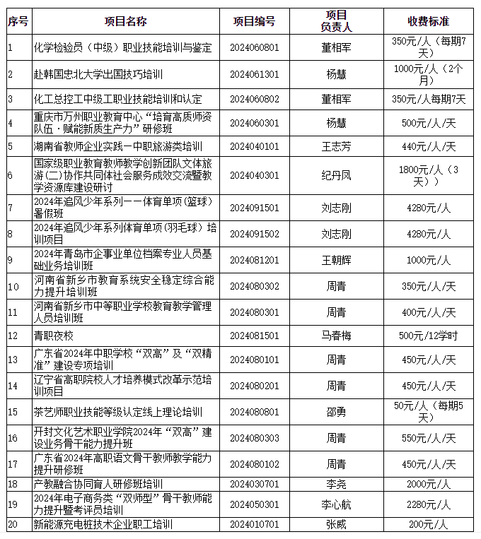 青島職業(yè)技術(shù)學院2024年培訓項目收費標準公示(一)