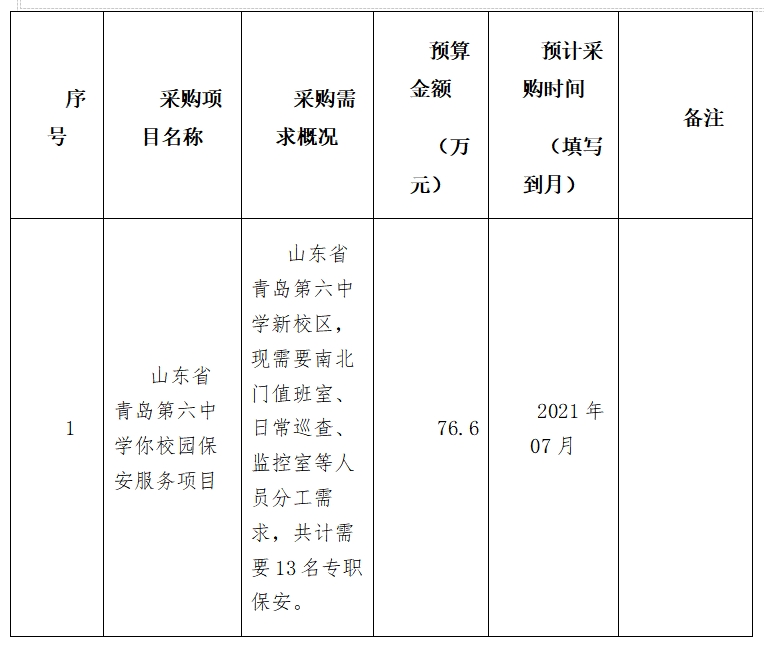 為便于供應(yīng)商及時了解政府采購信息,根據(jù)《財(cái)政部關(guān)于開展政府采購意向公開工作的通知》(財(cái)庫〔2020〕10號)等有關(guān)規(guī)定,現(xiàn)將 山東省青島第六中學(xué) 2021年 06(至)08 月采購意向公開如下: