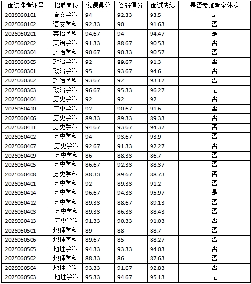 山東省青島第六中學選聘2025屆優(yōu)秀師范類畢業(yè)生面試成績公告
