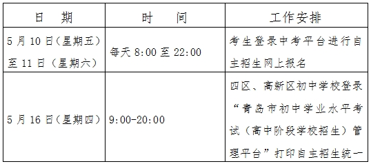 初中學(xué)校于5月16日(星期四)9:00-20:00期間登錄“青島市初中學(xué)業(yè)水平考試(高中階段學(xué)校招生)管理平臺(tái)”打印自主招生統(tǒng)一筆試測(cè)試通知單,并發(fā)放給考生。
