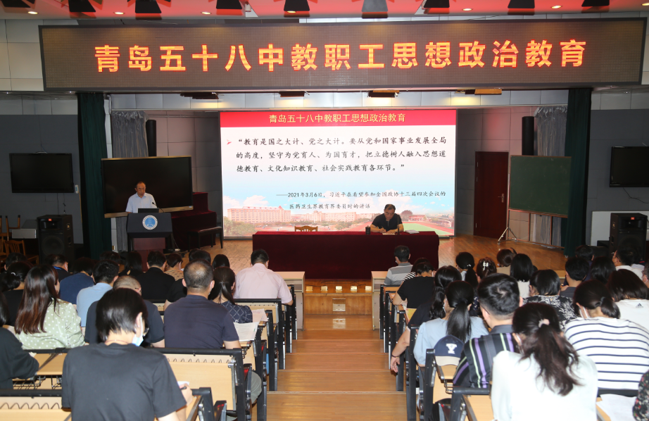 2022年9月29日下午,青島五十八中在學校報告廳召開大會,學習《習近平總書記給北京師范大學“優(yōu)師計劃”師范生重要回信精神的通知》,《通知》要求結(jié)合習近平總書記關(guān)于教育的重要講話,抓好習近平總書記重要回信精神的貫徹落實,進一步加強教師思想政治教育和師德師風建設(shè),落實意識形態(tài)責任制。
