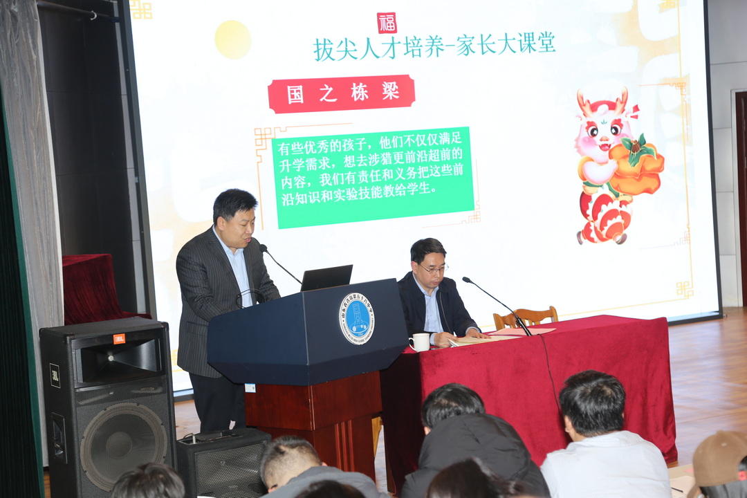 孫登照老師作為強(qiáng)基班優(yōu)秀班主任代表做了《乘勢(shì)而上 筑夢(mèng)未來》的主題發(fā)言。他從“勇于挑戰(zhàn)”“夢(mèng)想引領(lǐng)”“重塑課程”三個(gè)方面分享了強(qiáng)基班的班主任工作心得體會(huì)。孫老師依托班上家長(zhǎng)資源,他通過開展《聚焦芯片 彌補(bǔ)短板》《探索海洋新方式——海底游覽》《走進(jìn)再生科學(xué)》家長(zhǎng)大課堂等方式激發(fā)學(xué)生探索精神,幫助學(xué)生涉獵了解更前沿的科學(xué)技術(shù)并設(shè)計(jì)了獨(dú)屬于強(qiáng)基班的課程體系,立足高考,做好競(jìng)賽拓展,助力學(xué)生突破自身瓶頸。