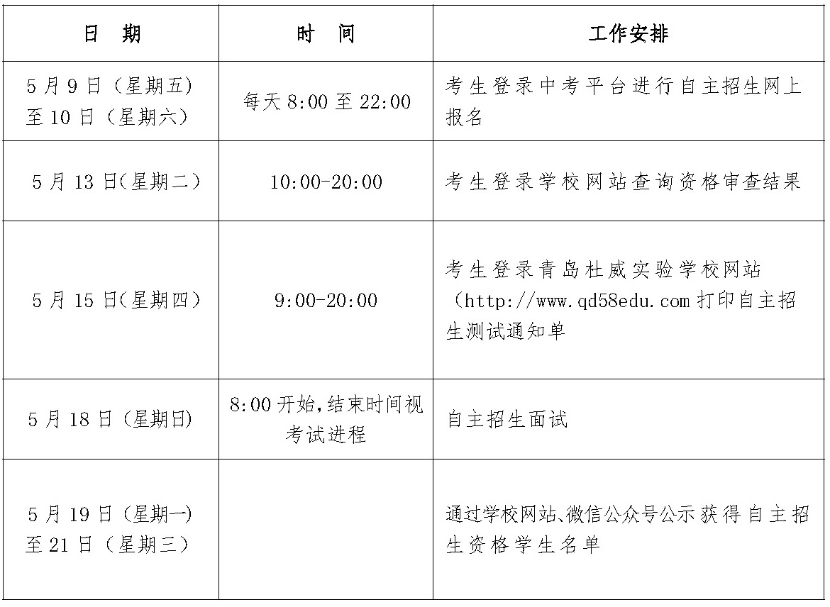 3.考生于5月15日(星期四)9:00-20:00期間登錄青島杜威實驗學(xué)校網(wǎng)站(http://www.qd58edu.com)打印自主招生測試通知單。