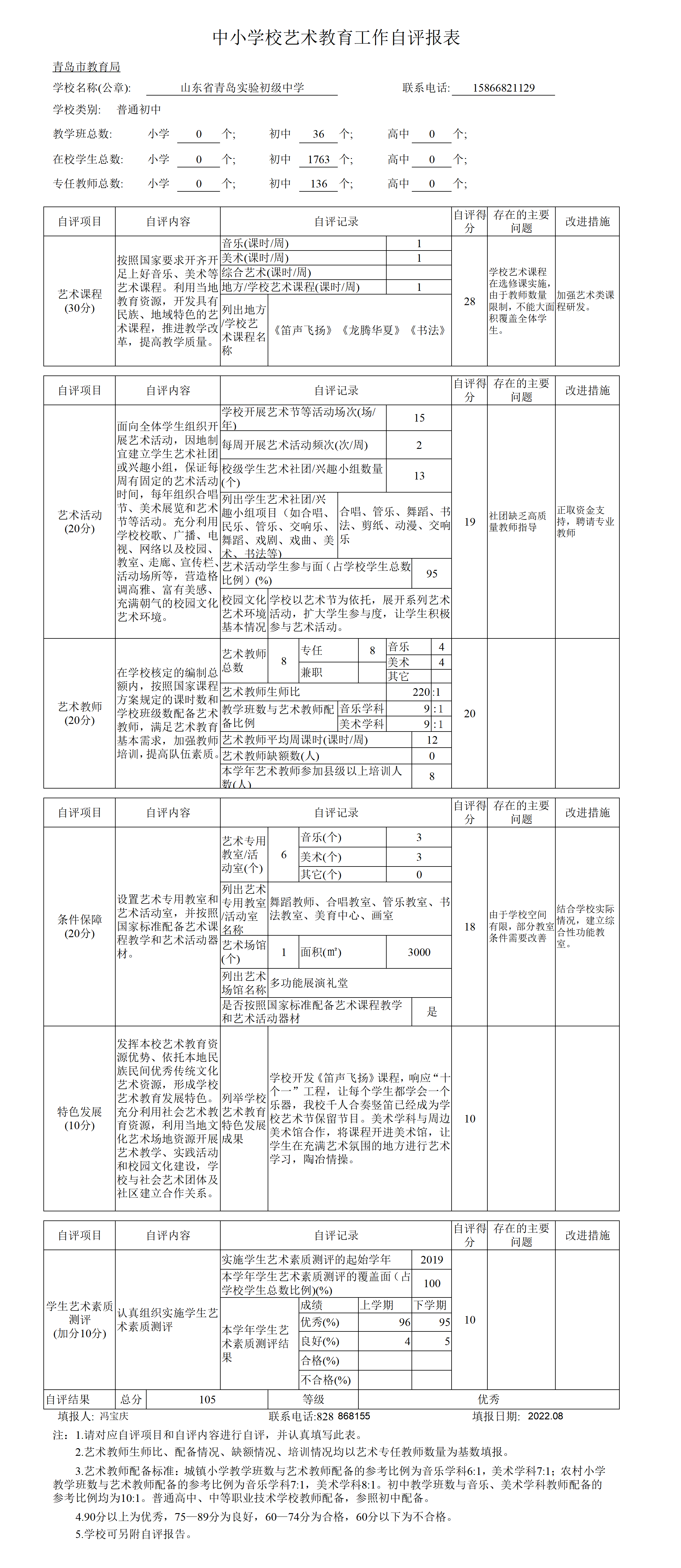 青島實驗初中2022年中小學校藝術(shù)教育工作自評報表