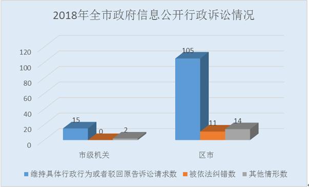 全市以信息公開為案由被提起行政訴訟案件147件。市級機(jī)關(guān)共17件,其中維持具體行政行為15件,糾錯(cuò)0件,其他情形2件;區(qū)市共130件,其中維持具體行政行為105件,糾錯(cuò)11件,其他情形14件。