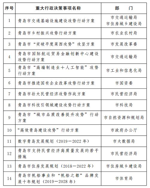 青島市政府2019年度重大行政決策事項(xiàng)目錄