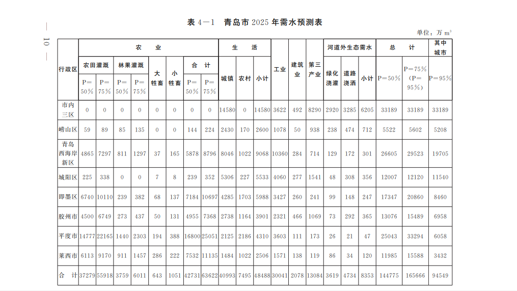 (二)城市水資源配置。根據(jù)預(yù)測,2025年青島城市需水量為94549萬m3。