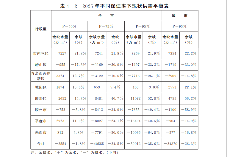 (五)全市水資源平衡。到“十四五”末,通過加大客水引調(diào)、加大非常規(guī)水在全市供水中的貢獻(xiàn)率,在P=50%保證率下,全市供水大于需水,余水25.2%;在P=75%保證率下,全市需水大于供水,缺水率1.0%,即墨區(qū)、膠州市、平度市、萊西市因農(nóng)業(yè)需水量較大出現(xiàn)缺水,缺水率分別為15.1%、4.9%、9.9%和39.7%;在P=95%保證率下,全市需水大于供水,缺水率12.1%,青島西海岸新區(qū)、即墨區(qū)、膠州市、平度市、萊西市缺水率分別為3.5%、27.3%、19.4%、26.4%和54.4%。