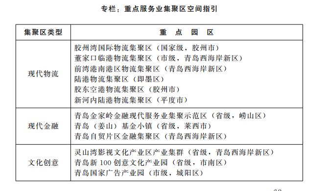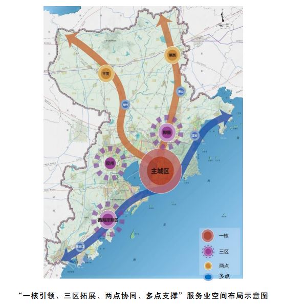4.多點支撐。依托藍谷、董家口、姜山、南村等功能性戰(zhàn)略支點,重點發(fā)展生產(chǎn)性服務業(yè);市南西部片區(qū)、市北郵輪母港區(qū)、李滄樓山后片區(qū)、城陽流亭機場片區(qū)等城市有機更新區(qū)域,圍繞增功能、增活力及創(chuàng)造高品質(zhì)城市新空間,積極發(fā)展商務服務、科技服務、文化創(chuàng)意、現(xiàn)代商貿(mào)等業(yè)態(tài)。