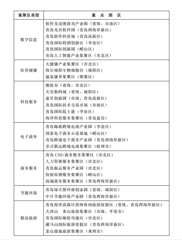 (二)重點推進現(xiàn)代服務業(yè)集聚區(qū)提質(zhì)升級。立足產(chǎn)業(yè)基礎、區(qū)位優(yōu)勢、資源條件和環(huán)境承載力,堅持因地制宜、分類發(fā)展,重點做強現(xiàn)代物流、現(xiàn)代金融、文化創(chuàng)意、數(shù)字信息四大優(yōu)勢引領型集聚區(qū),做大醫(yī)養(yǎng)健康、科技服務、電子商務、商務服務、節(jié)能環(huán)保五大新興成長型集聚區(qū),做優(yōu)精品旅游、時尚消費、新型專業(yè)市場三大傳統(tǒng)提升型集聚區(qū)。按照“完善提升一批、培育認定一批、規(guī)劃儲備一批”的原則,打造層次清晰、有序銜接的服務業(yè)集聚區(qū)發(fā)展梯隊。重點提升膠州灣國際物流園、金家?guī)X金融現(xiàn)代服務業(yè)集聚示范區(qū)、靈山灣影視文化產(chǎn)業(yè)集群等已獲批國家、省級服務業(yè)集聚區(qū)發(fā)展能級,力爭綜合實力躋身全國、全省前列,打造服務經(jīng)濟集聚發(fā)展的“排頭兵”。培育認定一批現(xiàn)代金融、數(shù)字信息、科技服務、時尚消費等市級現(xiàn)代服務業(yè)集聚區(qū),發(fā)揮特色優(yōu)勢,推動加速成長,打造服務經(jīng)濟集聚發(fā)展的“主力軍”。引導各區(qū)(市)規(guī)劃儲備北服時尚產(chǎn)業(yè)園、八大關高端文化集聚區(qū)等一批服務業(yè)集聚區(qū),規(guī)范發(fā)展模式,挖掘發(fā)展?jié)摿?,補齊發(fā)展短板,打造服務業(yè)集聚發(fā)展的“預備隊”。爭取新認定市級現(xiàn)代服務業(yè)集聚區(qū)30家左右。