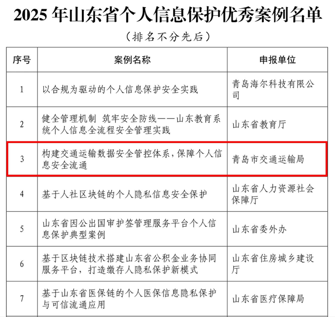 青島交通運輸數據安全管控體系獲評2025年山東省個人信息保護優(yōu)秀案例