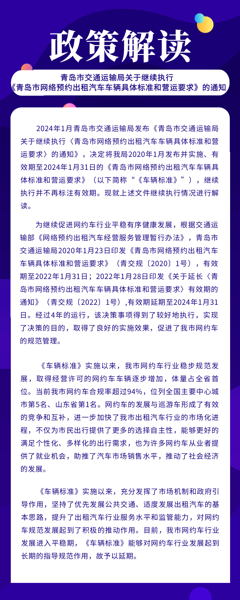 青島市交通運(yùn)輸局關(guān)于延長(zhǎng)《青島市網(wǎng)絡(luò)預(yù)約出租汽車(chē)車(chē)輛具體標(biāo)準(zhǔn)和營(yíng)運(yùn)要求》有效期的政策解讀