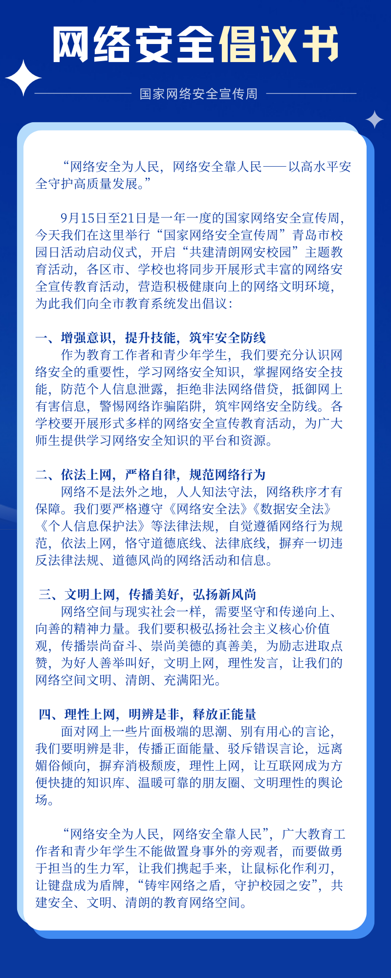 活動期間,市教育局還發(fā)出了《網(wǎng)絡(luò)安全倡議》,號召全市各級各類學校積極開展“六個一”系列活動:觀看一堂反詐網(wǎng)絡(luò)大課,組織一場網(wǎng)絡(luò)安全專題活動,開展一次網(wǎng)絡(luò)安全知識宣講,進行一次網(wǎng)絡(luò)安全風險排查,創(chuàng)作一批網(wǎng)絡(luò)安全創(chuàng)意作品,形成一批網(wǎng)絡(luò)安全數(shù)字資源,以更接地氣、更靈活的方式,開展形式多樣、貼近師生生活的網(wǎng)絡(luò)安全宣傳教育活動,吸引廣大師生積極參與、學有所獲。