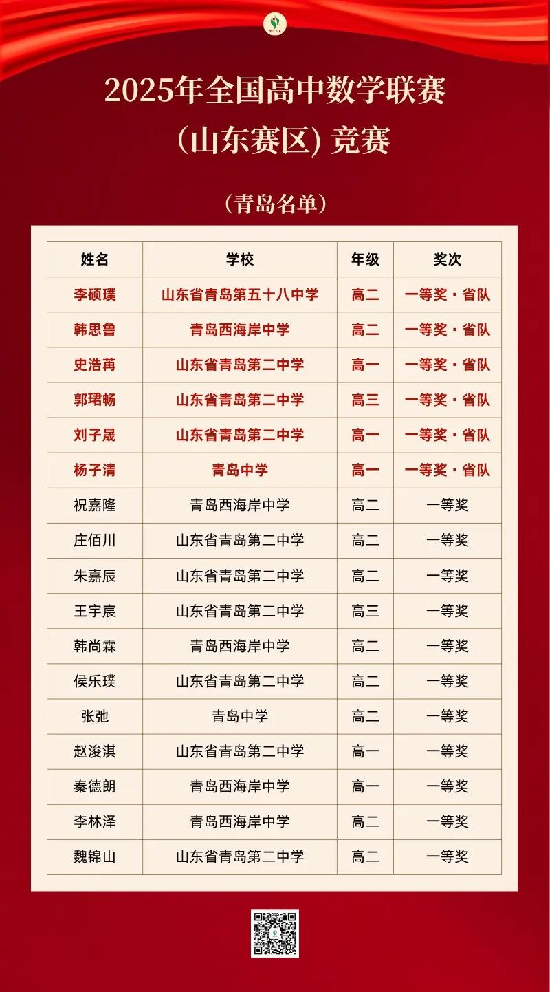 近日,2025年全國高中數(shù)學聯(lián)賽(山東賽區(qū)) 競賽結(jié)果揭曉,共產(chǎn)生一等獎90人,其中19人入選省集訓隊。我市共有17名學生榮獲全國初賽一等獎,占全省一等獎總?cè)藬?shù)的18.9%;其中6名學生成功入選省集訓隊,占全省集訓隊人數(shù)的31.6%,取得了歷屆省賽最好成績。
