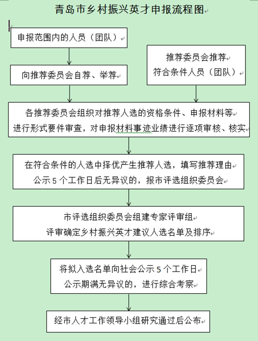 ?。ǘ┟鞔_了評(píng)選方法和程序?!掇k法》明確,青島市鄉(xiāng)村振興英才評(píng)選工作在市人才工作領(lǐng)導(dǎo)小組領(lǐng)導(dǎo)下,采取自薦、舉薦、推薦委員會(huì)推薦相結(jié)合的方式進(jìn)行。市委組織部、市農(nóng)業(yè)農(nóng)村局、市財(cái)政局、市人力資源社會(huì)保障局聯(lián)合組成青島市鄉(xiāng)村振興英才評(píng)選組織委員會(huì),負(fù)責(zé)具體實(shí)施工作。青島市鄉(xiāng)村產(chǎn)業(yè)振興工作專班、鄉(xiāng)村人才振興工作專班、鄉(xiāng)村文化振興工作專班、鄉(xiāng)村生態(tài)振興工作專班、鄉(xiāng)村組織振興工作專班、青島日?qǐng)?bào)社、青島市廣播電視臺(tái)成立7個(gè)推薦委員會(huì),負(fù)責(zé)青島市鄉(xiāng)村振興英才人選推薦。各推薦委員會(huì)根據(jù)評(píng)選維度標(biāo)準(zhǔn),推薦本專班、本領(lǐng)域人選;各市場(chǎng)主體、個(gè)人可向所在領(lǐng)域的工作專班推薦委員會(huì)自薦、舉薦人選,不得向青島日?qǐng)?bào)社、青島市廣播電視臺(tái)推薦委員會(huì)自薦、推薦。市評(píng)選組織委員會(huì)組建專家評(píng)審組,根據(jù)貢獻(xiàn)情況確定鄉(xiāng)村振興英才建議人選名單及排序。 鄉(xiāng)村振興英才申報(bào)流程詳見下圖。