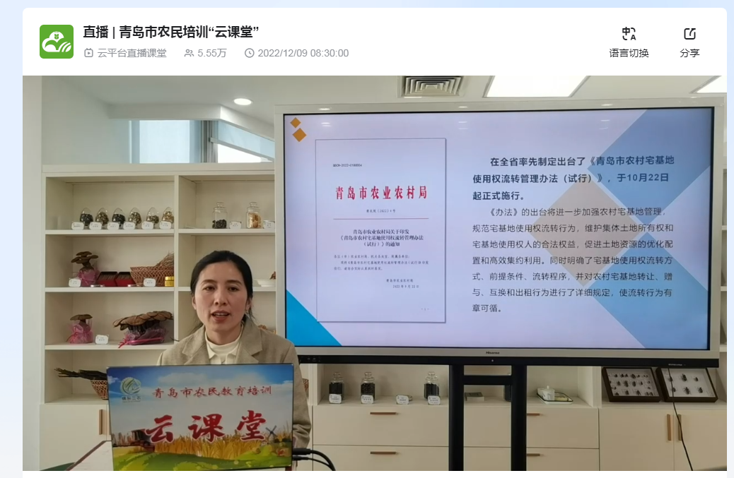 12月9日,市農(nóng)業(yè)農(nóng)村局宋揚(yáng)副處長(zhǎng)、博士,通過青島市農(nóng)民培訓(xùn)”云課堂“,線上解讀《青島市農(nóng)村宅基地使用權(quán)流轉(zhuǎn)管理辦法(試行)》