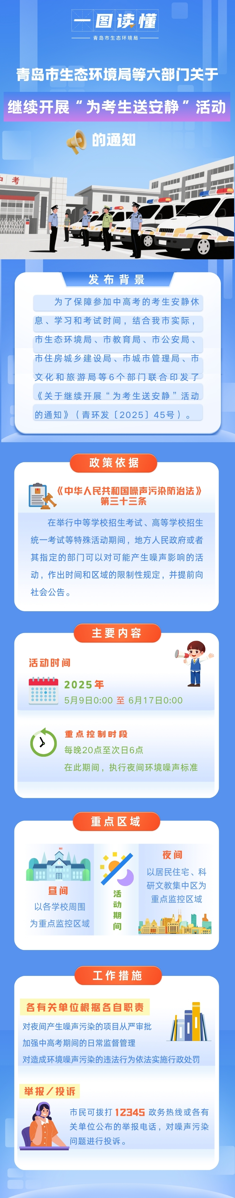 【圖片解讀】青島市生態(tài)環(huán)境局等六部門關(guān)于繼續(xù)開展“為考生送安靜”活動的通知