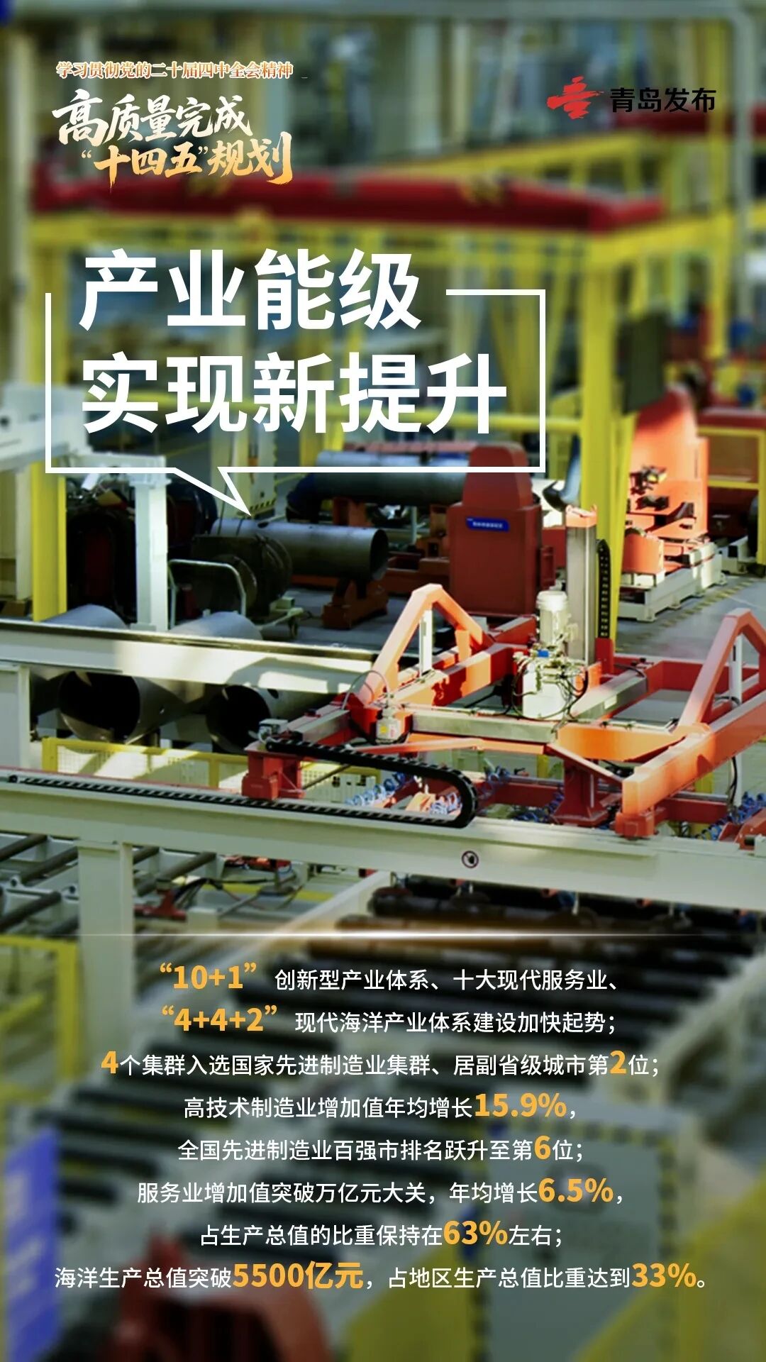 海洋生產總值突破5500億元、居全國沿海城市第三位,占地區(qū)生產總值比重達到33%?!吧詈R惶枴薄昂?惶枴钡取按髧仄鳌苯桓哆\營。青島港貨物、集裝箱吞吐量躍升到全球第4和第5位,在新華·波羅的海國際航運中心發(fā)展指數(shù)中排名躍居全球第13位,集裝箱海鐵聯(lián)運量連續(xù)10年保持全國首位。