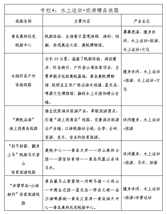 2.推進水上運動+文化融合發(fā)展。加大水上運動公益廣告宣傳力度,依托奧帆博物館等文化資源,普及水上運動知識,推廣水上運動文化,營造水上運動氛圍。充分發(fā)揮水上運動名人的示范引領作用,依托水上運動城市形象大使,水上運動推廣普及與水上運動城市品牌國際宣傳結合,培育具有優(yōu)秀品德和良好運動成績的水上運動明星,打造水上運動賽事活動文化品牌,積極開發(fā)水上運動文創(chuàng)產(chǎn)品,鼓勵消費者參與水上運動文化創(chuàng)意體驗活動,擴大水上運動文化消費。開發(fā)水上運動文化展演,舉辦水上運動文化論壇,辦好中國(青島)國際海洋體育大會,挖掘水上運動文化價值,培育體現(xiàn)時代精神、帶有本地特色的水上運動文化品牌。依托燈光秀、無人機表演創(chuàng)新水上運動文化傳播模式,開展水上運動文化藝術創(chuàng)作,形成青島水上運動文化高地。