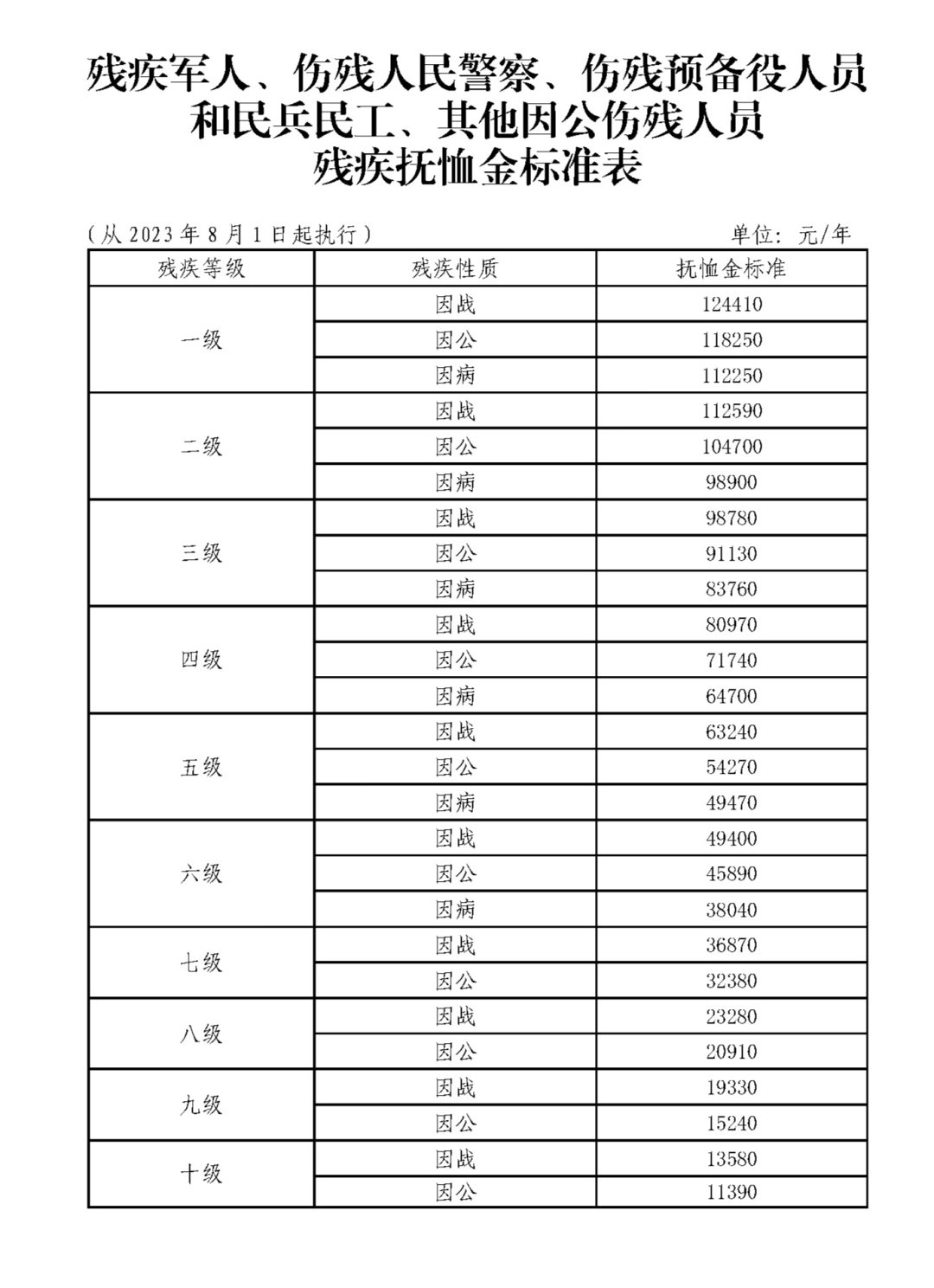 殘疾軍人(含傷殘人民警察、傷殘預(yù)備役人員和民兵民工、其他因公傷殘人員)的殘疾撫恤金標(biāo)準(zhǔn),按照國家、山東省的統(tǒng)一標(biāo)準(zhǔn)落實。