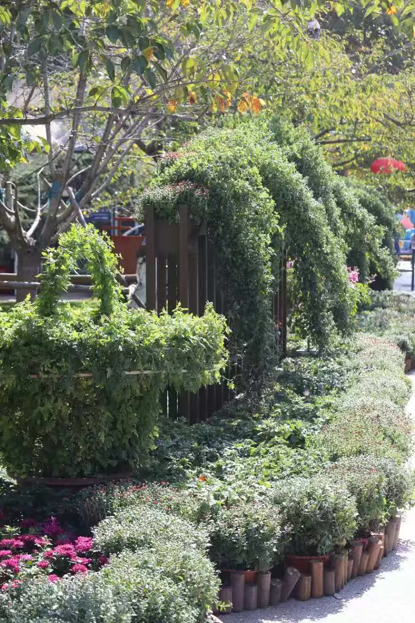 菊韻流霞:南門區(qū)域以懸崖菊為主景,紅、黃、粉三色花朵如流霞傾瀉,搭配造型孔雀、橄欖狀菊球等,營造出富有節(jié)奏感的入口景觀。