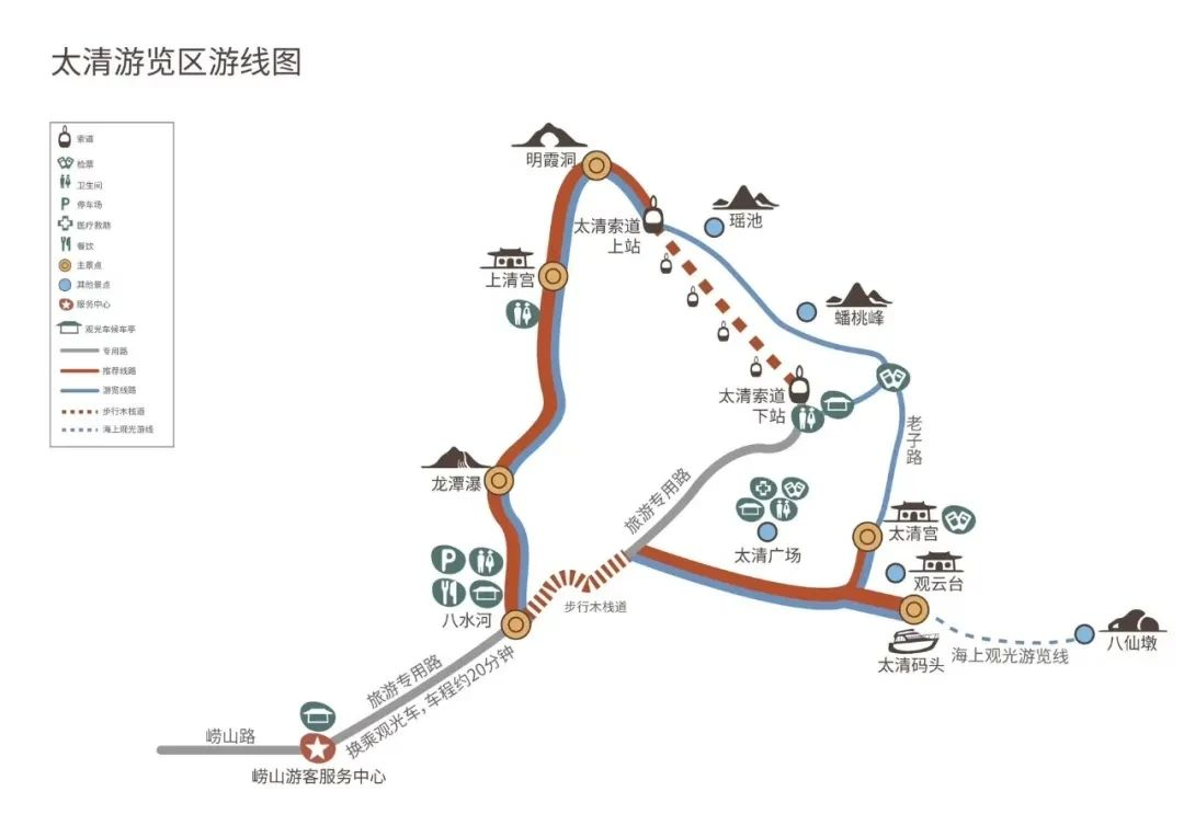 推薦線路①(乘索道上山):嶗山(大河東)游客服務中心乘坐景區(qū)觀光車→八水河廣場下車→步行醉美山海木棧道→太清宮→沿老子路步行或在太清廣場乘坐觀光車至太清索道(上行)→明霞洞→上清宮→龍?zhí)镀佟怂印怂油\噲龀擞^光車→嶗山(大河東)游客服務中心。