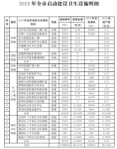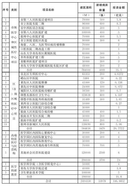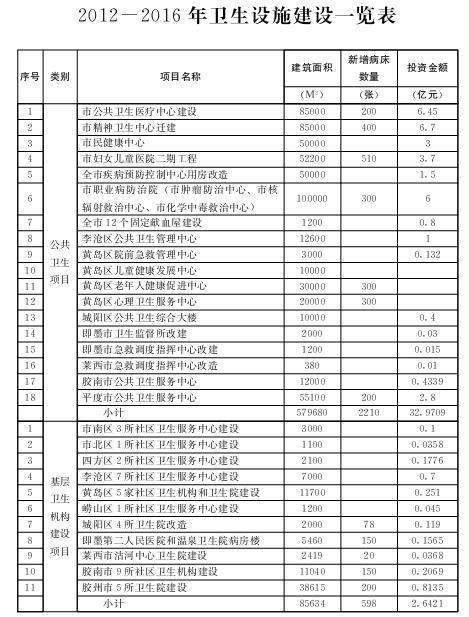 實施市北區(qū)??漆t(yī)療中心建設、城陽人民醫(yī)院病房樓擴建、即墨市東部醫(yī)療中心建設、萊西市人民醫(yī)院門診綜合樓和市立醫(yī)院門診病房樓建設、膠南人民醫(yī)院綜合病房樓建設、膠州市新城區(qū)人民醫(yī)院建設等項目。