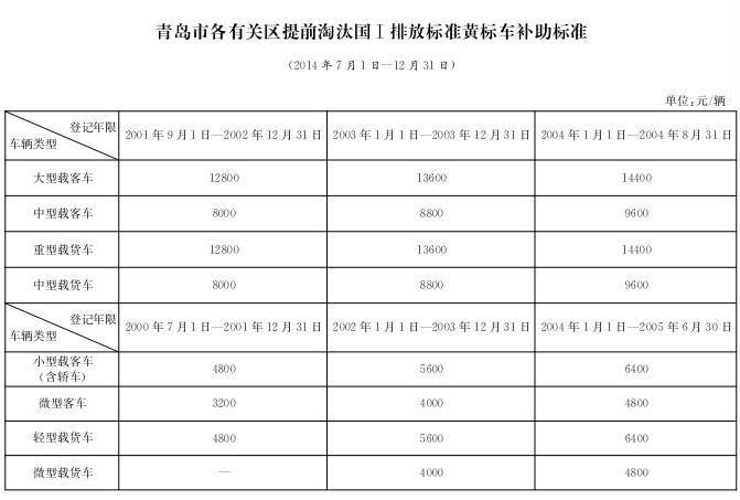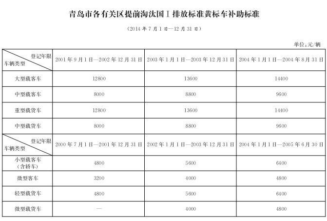 2.青島市各有關(guān)區(qū)提前淘汰國Ⅰ排放標(biāo)準(zhǔn)黃標(biāo)車補(bǔ)助標(biāo)準(zhǔn)(2014年7月1日—12月31日)