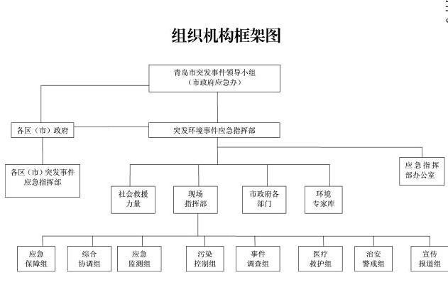 區(qū)(市)政府成立相應(yīng)的突發(fā)環(huán)境事件應(yīng)急組織體系,參照青島市突發(fā)環(huán)境事件應(yīng)急組織體系確定機構(gòu)單位及職責(zé)。