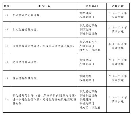 1.推進(jìn)體制機(jī)制改革。加大改革工作力度,深化城市基礎(chǔ)設(shè)施規(guī)劃、建設(shè)和管理等環(huán)節(jié)的體制機(jī)制改革。按照“市級(jí)統(tǒng)籌、重在調(diào)控”的原則,強(qiáng)化市級(jí)政府對(duì)基礎(chǔ)設(shè)施規(guī)劃、建設(shè)和管理的宏觀調(diào)控力度,建立健全配套政策,明確牽頭部門和單位,落實(shí)責(zé)任目標(biāo)任務(wù),做到責(zé)、權(quán)、利相統(tǒng)一,統(tǒng)籌做好城市基礎(chǔ)設(shè)施規(guī)劃、建設(shè)與管理。按照“重心下移、分級(jí)負(fù)責(zé)”的原則,根據(jù)項(xiàng)目規(guī)模、區(qū)位等要素確定實(shí)施主體,原則上市級(jí)政府集中精力組織實(shí)施全市性重大項(xiàng)目和跨部門、跨區(qū)(市)項(xiàng)目,其他項(xiàng)目要充分發(fā)揮區(qū)(市)級(jí)政府對(duì)基礎(chǔ)設(shè)施建設(shè)和管理的主體職能,按照屬地化原則由區(qū)(市)級(jí)政府組織實(shí)施。全市性重大項(xiàng)目要建立指揮部體系,加強(qiáng)統(tǒng)籌協(xié)調(diào);跨部門、跨區(qū)(市)的要建立聯(lián)席會(huì)議制度,加強(qiáng)聯(lián)動(dòng)配合,有序推進(jìn)基礎(chǔ)設(shè)施建設(shè)和管理。對(duì)區(qū)(市)級(jí)政府組織實(shí)施的項(xiàng)目,區(qū)(市)級(jí)政府要全力抓節(jié)點(diǎn)、抓控制、抓進(jìn)度、求實(shí)效;市級(jí)政府要抓好規(guī)劃、指導(dǎo)、督促、協(xié)調(diào)、觀摩、考評(píng)、獎(jiǎng)懲、通報(bào)等統(tǒng)籌協(xié)調(diào)工作,對(duì)重點(diǎn)項(xiàng)目實(shí)施以獎(jiǎng)代補(bǔ),形成良好的示范帶動(dòng)作用,努力建設(shè)精品工程。