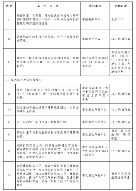 做好國家和省削減、下放事項的承接落實工作。全面清理、取消市和區(qū)(市)非行政許可審批事項,2015年年底前不再保留非行政許可審批事項類別。全面完成市和區(qū)(市)政府部門權(quán)力清單、責(zé)任清單編制工作,督促各級各部門嚴(yán)格按照清單全面依法行使權(quán)力、履行職能、落實責(zé)任。實行公開透明審批,推進行政審批流程再造。積極推進部門(單位)行政審批“兩集中、兩到位”,市級行政審批事項原則上全部納入政務(wù)服務(wù)大廳或?qū)I(yè)分大廳辦理。大力推行行政審批標(biāo)準(zhǔn)化,指導(dǎo)督促各級各部門按照規(guī)范要求,對正在實施的行政審批事項逐項編寫業(yè)務(wù)手冊、服務(wù)指南,進一步清理審批要件,規(guī)范審批裁量權(quán),提高審批效能。對已明確取消、下放的行政審批事項,要嚴(yán)格按規(guī)定執(zhí)行,及時糾正明放暗不放、變相審批、違規(guī)增設(shè)審批條件等行為,確保取消、下放的行政審批事項落實到位。開展行政審批事項網(wǎng)上梳理工作,深入推進網(wǎng)上審批,逐步提高審批事項網(wǎng)上辦理比例,在市南區(qū)開展網(wǎng)上審批試點工作,并面向全市推廣。根據(jù)國家和省部署,研究提出指導(dǎo)規(guī)范市政府部門證照管理的工作方案,對增加企業(yè)負(fù)擔(dān)的證照組織開展清理規(guī)范。清理規(guī)范行政審批中介服務(wù),實行中介服務(wù)清單管理;推進中介服務(wù)機構(gòu)與政府審批部門脫鉤,切斷中介服務(wù)利益關(guān)聯(lián),進一步放開市場,加強監(jiān)管。