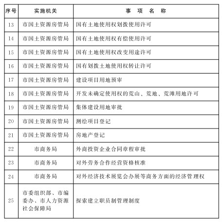 (一)青島高新技術(shù)產(chǎn)業(yè)開(kāi)發(fā)區(qū)(紅島經(jīng)濟(jì)區(qū))范圍內(nèi)投資發(fā)展類(lèi)、國(guó)土資源類(lèi)等25項(xiàng)行政管理權(quán)限委托青島高新技術(shù)產(chǎn)業(yè)開(kāi)發(fā)區(qū)(紅島經(jīng)濟(jì)區(qū))實(shí)施,具體賦權(quán)目錄詳見(jiàn)附件。