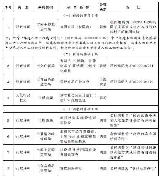 根據(jù)《山東省人民政府關(guān)于2016年第一批削減省級(jí)行政許可等權(quán)力事項(xiàng)的通知》(魯政字〔2016〕108號(hào))、《山東省人民政府審改辦關(guān)于行政許可事項(xiàng)動(dòng)態(tài)調(diào)整有關(guān)事宜的通知》(魯審改發(fā)〔2016〕3號(hào)),現(xiàn)將我市2016年第二批市級(jí)行政權(quán)力事項(xiàng)調(diào)整目錄予以公布,自公布之日起實(shí)施。