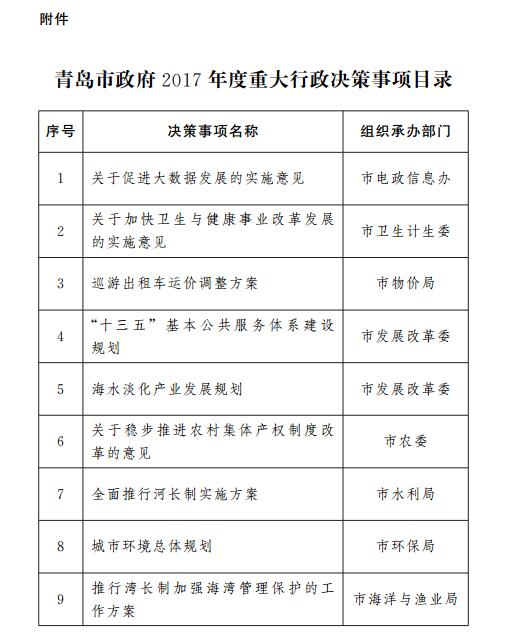 附件: 青島市政府2017年度重大行政決策事項(xiàng)目錄