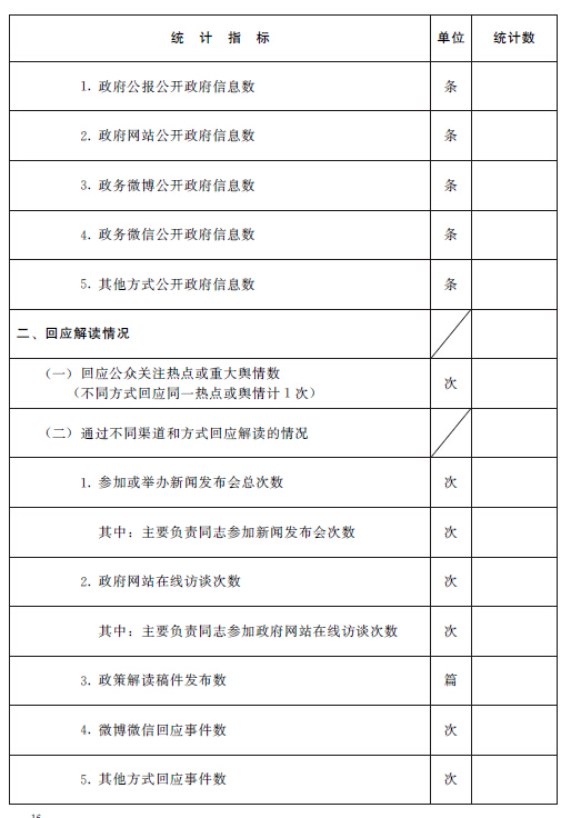 14.政策解讀稿件發(fā)布數(shù):指通過政府網(wǎng)站、新聞發(fā)布會、媒體通氣會以及報刊、廣播、電視等方式發(fā)布政策解讀稿件的總篇數(shù)。