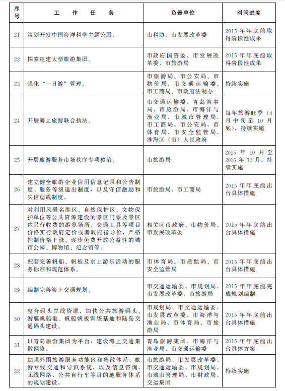 ?。ㄒ唬┩七M(jìn)依法治旅。完善綜合監(jiān)管機(jī)制,全面優(yōu)化旅游市場環(huán)境,強(qiáng)化“一日游”管理,開展海上旅游聯(lián)合執(zhí)法和旅游服務(wù)市場秩序?qū)m椪?,運(yùn)用信息化手段努力提高旅游市場監(jiān)管、旅游執(zhí)法水平和投訴處理能力。建立健全旅游企業(yè)信用信息記錄和公告制度、服務(wù)等級退出制度、守信激勵和失信懲戒機(jī)制,加強(qiáng)行業(yè)自律和輿論監(jiān)督。著力提高旅游從業(yè)人員的文明意識、形象意識和環(huán)境意識,進(jìn)一步落實游客不文明行為記錄制度,積極開展旅游志愿者義務(wù)服務(wù),提升公民出游文明素質(zhì)。對利用風(fēng)景名勝區(qū)、自然保護(hù)區(qū)、文物保護(hù)單位等公共資源建設(shè)的景區(qū)及景區(qū)內(nèi)另行收費(fèi)的游覽場所、交通工具等項目價格實行政府定價或者政府指導(dǎo)價,嚴(yán)格控制價格上漲,逐步免費(fèi)開放公益性的城市公園、博物館、紀(jì)念館等。配套完善帆船、帆板及水上游樂活動的服務(wù)標(biāo)準(zhǔn)和規(guī)范體系。有效落實機(jī)場口岸72小時過境免簽政策和境外游客購物離境退稅政策。