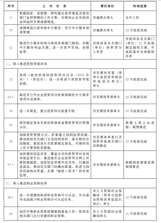 做好國(guó)家和省削減、下放事項(xiàng)的承接落實(shí)工作。全面清理、取消市和區(qū)(市)非行政許可審批事項(xiàng),2015年年底前不再保留非行政許可審批事項(xiàng)類別。全面完成市和區(qū)(市)政府部門權(quán)力清單、責(zé)任清單編制工作,督促各級(jí)各部門嚴(yán)格按照清單全面依法行使權(quán)力、履行職能、落實(shí)責(zé)任。實(shí)行公開透明審批,推進(jìn)行政審批流程再造。積極推進(jìn)部門(單位)行政審批“兩集中、兩到位”,市級(jí)行政審批事項(xiàng)原則上全部納入政務(wù)服務(wù)大廳或?qū)I(yè)分大廳辦理。大力推行行政審批標(biāo)準(zhǔn)化,指導(dǎo)督促各級(jí)各部門按照規(guī)范要求,對(duì)正在實(shí)施的行政審批事項(xiàng)逐項(xiàng)編寫業(yè)務(wù)手冊(cè)、服務(wù)指南,進(jìn)一步清理審批要件,規(guī)范審批裁量權(quán),提高審批效能。對(duì)已明確取消、下放的行政審批事項(xiàng),要嚴(yán)格按規(guī)定執(zhí)行,及時(shí)糾正明放暗不放、變相審批、違規(guī)增設(shè)審批條件等行為,確保取消、下放的行政審批事項(xiàng)落實(shí)到位。開展行政審批事項(xiàng)網(wǎng)上梳理工作,深入推進(jìn)網(wǎng)上審批,逐步提高審批事項(xiàng)網(wǎng)上辦理比例,在市南區(qū)開展網(wǎng)上審批試點(diǎn)工作,并面向全市推廣。根據(jù)國(guó)家和省部署,研究提出指導(dǎo)規(guī)范市政府部門證照管理的工作方案,對(duì)增加企業(yè)負(fù)擔(dān)的證照組織開展清理規(guī)范。清理規(guī)范行政審批中介服務(wù),實(shí)行中介服務(wù)清單管理;推進(jìn)中介服務(wù)機(jī)構(gòu)與政府審批部門脫鉤,切斷中介服務(wù)利益關(guān)聯(lián),進(jìn)一步放開市場(chǎng),加強(qiáng)監(jiān)管。
