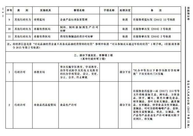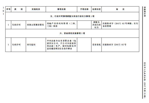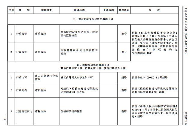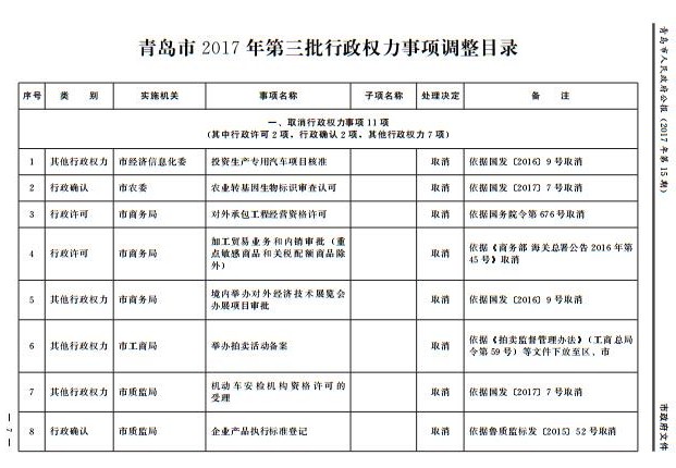 根據(jù)《國務院關于第三批取消中央指定地方實施行政許可事項的決定》(國發(fā)〔2017〕7號)、《山東省人民政府關于2017年第一批削減省級行政權力事項和清理規(guī)范行政審批中介服務收費項目的通知》(魯政字〔2017〕82號),按照《山東省權力清單動態(tài)管理辦法》(魯政字〔2016〕76號)要求,現(xiàn)將我市2017年第三批市級行政權力事項調(diào)整目錄予以公布,并自公布之日起實施。