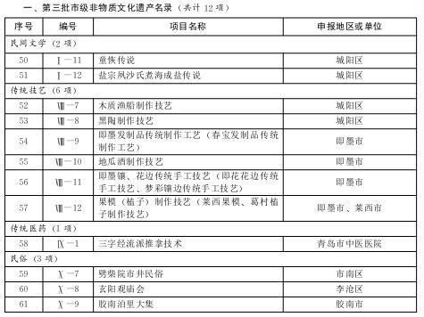 青島市第三批市級非物質(zhì)文化遺產(chǎn)名錄和市級非物質(zhì)文化遺產(chǎn)擴(kuò)展項(xiàng)目名錄(名單附后)已經(jīng)市政府同意,現(xiàn)予公布。