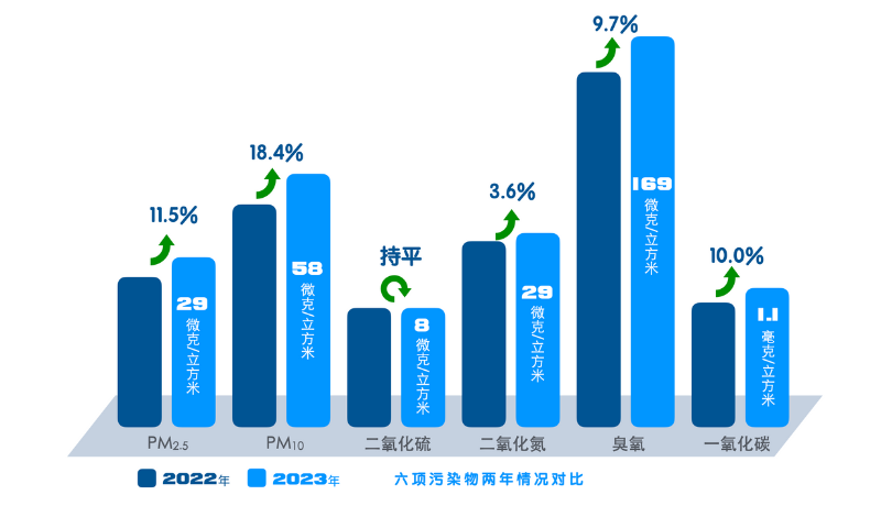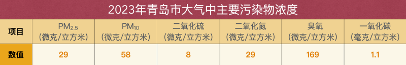 2023年,青島市環(huán)境空氣中PM2.5、PM10、二氧化硫、二氧化氮、臭氧濃度分別為29、58、8、29、169微克/立方米,一氧化碳濃度為1.1毫克/立方米。六項(xiàng)污染物中,PM2.5、PM10、二氧化硫、二氧化氮、一氧化碳濃度均符合《環(huán)境空氣質(zhì)量標(biāo)準(zhǔn)》(GB3095-2012)中二級(jí)標(biāo)準(zhǔn),臭氧濃度超過(guò)二級(jí)標(biāo)準(zhǔn)0.06倍,與2022年相比,PM2.5、PM10、二氧化氮、臭氧、一氧化碳濃度分別升高11.5%、18.4%、3.6%、9.7%、10.0%,二氧化硫濃度持平??諝赓|(zhì)量?jī)?yōu)良率82.2%,全省排名第四。