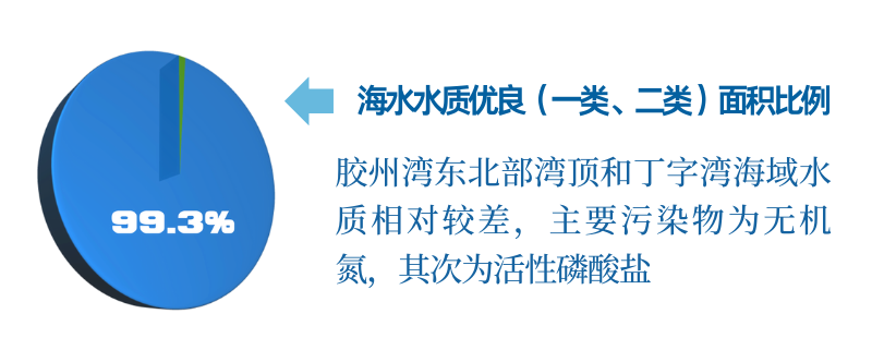 2023年,青島市近岸海域水質(zhì)狀況總體良好,海水水質(zhì)優(yōu)良(一類(lèi)、二類(lèi))面積比例達(dá)到99.3%,海洋生態(tài)環(huán)境保持穩(wěn)定。膠州灣東北部灣頂和丁字灣海域水質(zhì)相對(duì)較差,主要污染物為無(wú)機(jī)氮,其次為活性磷酸鹽。