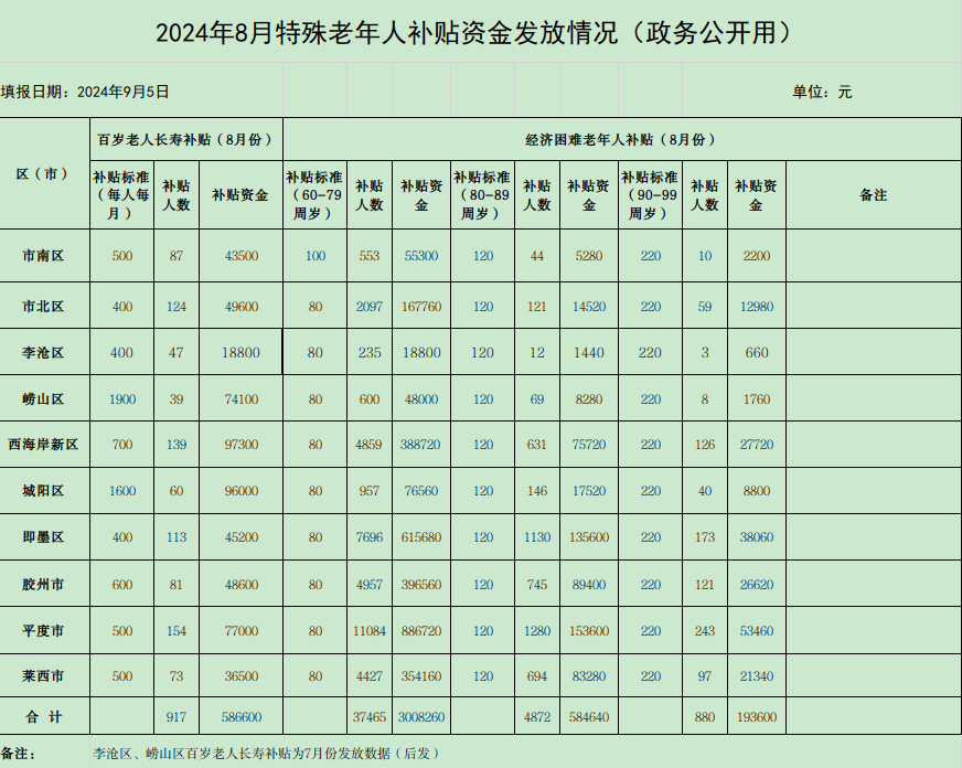 2024年8月特殊老年人補(bǔ)貼資金發(fā)放情況