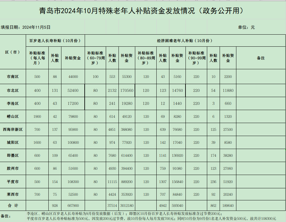 2024年10月特殊老年人補(bǔ)貼資金發(fā)放情況