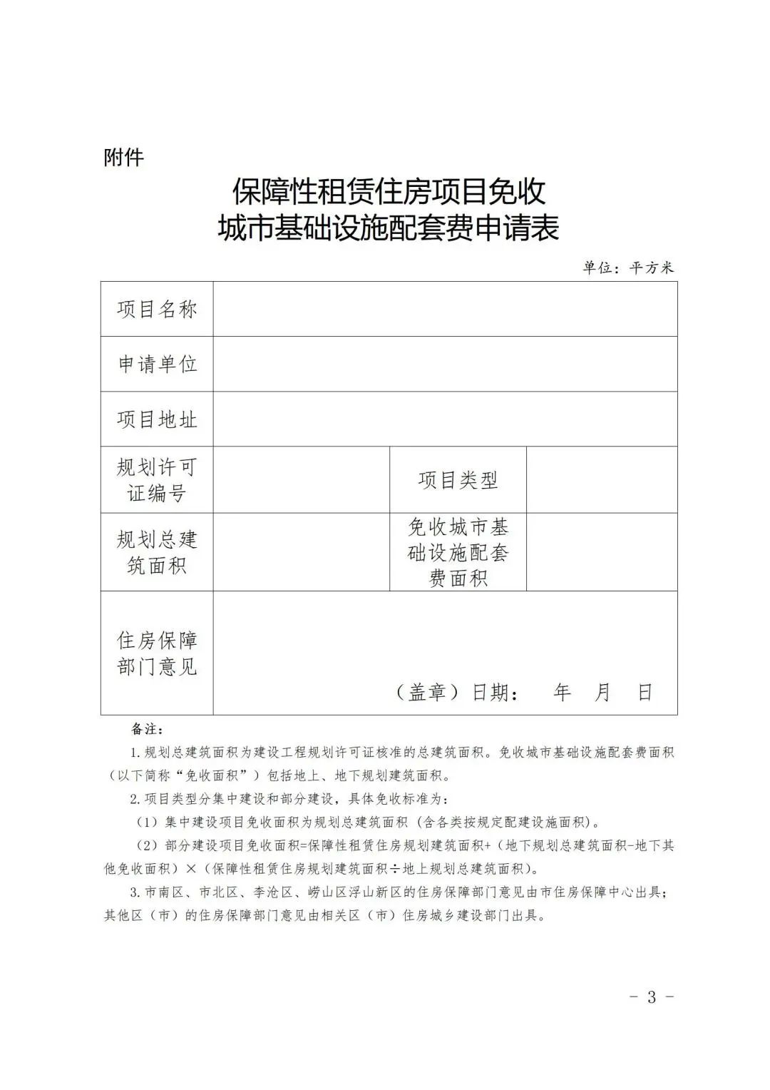 三、部分建設(shè)項(xiàng)目的開(kāi)發(fā)企業(yè)在申請(qǐng)保障性租賃住房配套費(fèi)免收時(shí),應(yīng)明確項(xiàng)目地下規(guī)劃建筑面積中涉及的全部配套費(fèi)免收事項(xiàng),并確保享受不同優(yōu)惠(含免收)政策的面積沒(méi)有重疊;住房保障部門根據(jù)開(kāi)發(fā)企業(yè)提供的相關(guān)證明材料綜合計(jì)算后,出具《保障性租賃住房項(xiàng)目免收城市基礎(chǔ)設(shè)施配套費(fèi)申請(qǐng)表》相關(guān)意見(jiàn)。
