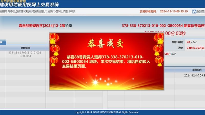 近日,李滄區(qū)東南渠LC0802-101-1住宅用地成功出讓。地塊位于李滄區(qū)重慶中路以東、湘潭路以南,土地面積15357.5㎡,規(guī)劃建筑面積30715㎡,起拍價為樓面地價7500元/㎡,土地總價約2.3億元,由中能建(青島)城市建設(shè)發(fā)展有限公司競得。